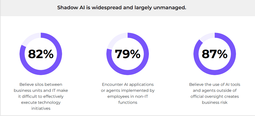 Most IT executives believe silos between business units and IT make it difficult to execute technology initiatives effectively (82%), and the use of AI tools and agents outside official oversight creates business risk (87%).