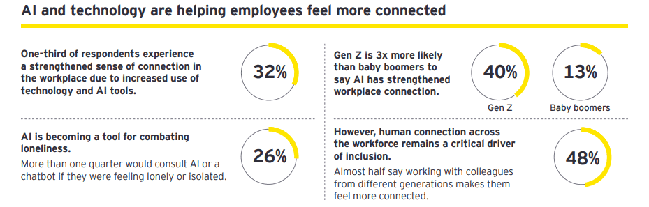 As people feel more disconnected in the workplace, AI and technology are helping the workforce feel a greater sense of belonging. The EY Global Belonging Barometer 4.0 has revealed that 32% of respondents experience a stronger connection in the workplace through the increased use of technology and AI tools.