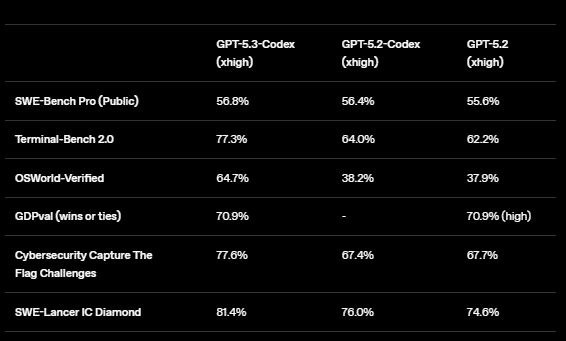 In four benchmarks measuring coding, agentic, and real-world skills, GPT‑5.3-Codex outperforms previous models on SWE-Bench Pro and Terminal-Bench, with strong results on OSWorld and GDPval.